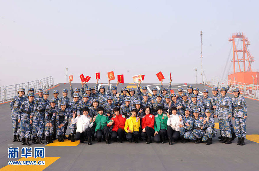 The Liaoning aircraft carrier welcomes nearly 100 female soldiers. (Photo/ Xinhua)