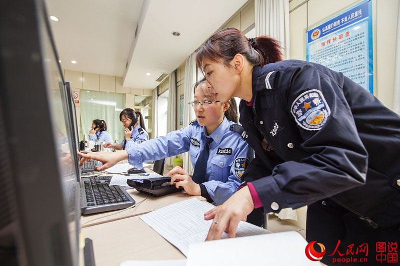 Long Xian and Long Yan work in a 110 police service center in Luliang, north China's Shanxi Province. (Photo/people.cn)