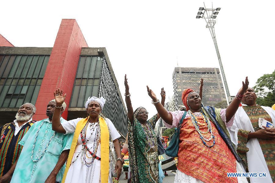 People take part in the celebration of Black Consciousness Day in Sao Paulo, Brazil, on Nov. 20, 2014. The Day of Black Consciousness was first celebrated in 1978 to commemorate Zumbi dos Palmares, a black Brazilian who led a group of runaway slaves in Brazil, known as the Quilombo dos Palmares, to fight the then Portuguese colonizers in the 17th century and was killed in an ambush on Nov. 20, 1695. (Xinhua/ Rahel Patrasso)