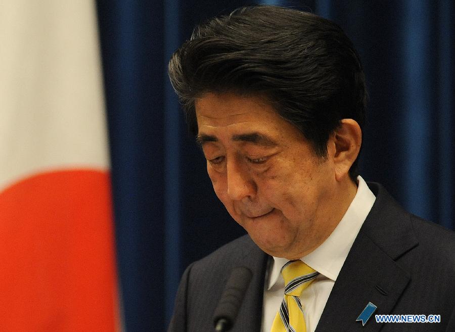 Japanese Prime Minister Shinzo Abe bites his lips during a press conference at his official residence in Tokyo, Japan, Nov. 21, 2014. Japan dissolved the House of Representatives, or the lower house in its bicameral parliament, on Friday for a general election slated for Dec. 14, with Prime Minister Shinzo Abe's economic policies dubbed "Abenomics" and other polices to be tested in the looming vote. (Xinhua/Stringer) |