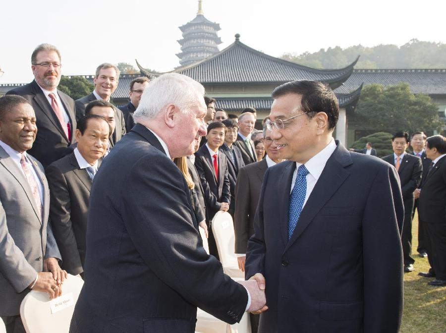 Chinese Premier Li Keqiang (R front) meets with representatives attending the World Internet Conference, in Hangzhou, capital of east China's Zhejiang Province, Nov. 20, 2014. (Xinhua/Wang Ye)