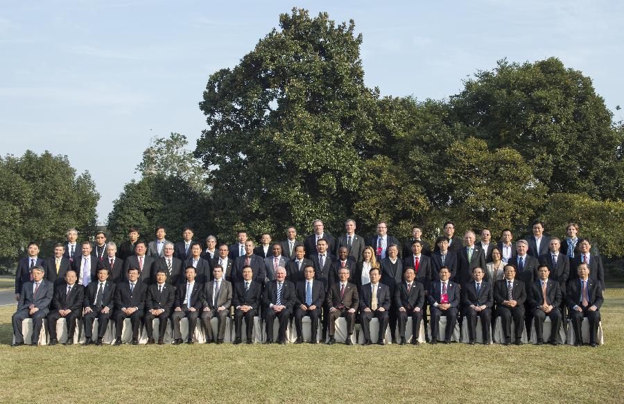 Chinese Premier Li Keqiang (9th R front) poses for a group photo during his meeting with representatives attending the World Internet Conference, in Hangzhou, capital of east China's Zhejiang Province, Nov. 20, 2014. (Xinhua/Wang Ye)