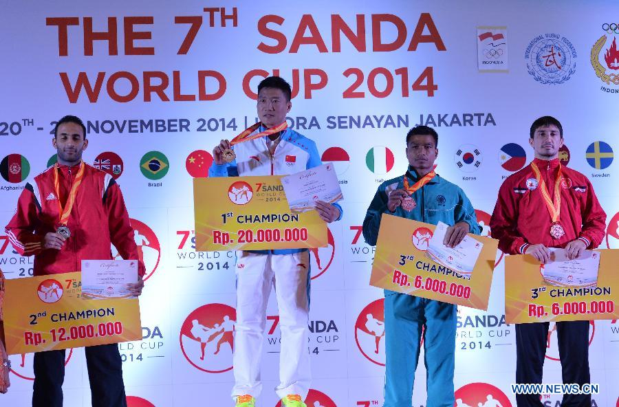 Zhang Kaiyin (2nd L) of China poses for photograph during the awarding ceremony of the Men's Sanda-75kg during the 7th Sanda World Cup in Jakarta, Indonesia, Nov. 21, 2014. Zhang Kaiyin won the gold medal. (Xinhua/Zulkarnain)