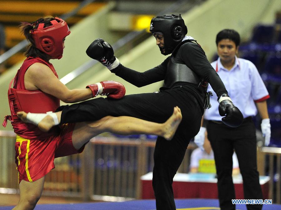 Sharbano Mansouryan (R) of Iran competes against Yen Nguyen Thi Hai of Vietnam at the Women's Sanda-75kg final event during the 7th Sanda World Cup in Jakarta, Indonesia, Nov. 21, 2014. (Xinhua/Zulkarnain)