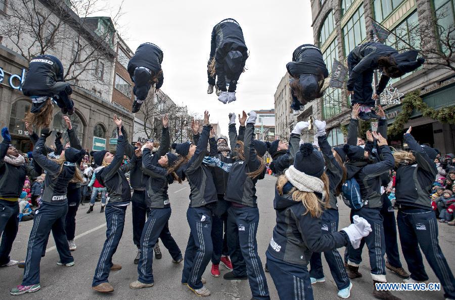Montreal's annual Santa Claus parade is held in Montreal's downtown core on Nov. 22, 2014. There are more than 1,000 performers including acrobats, dancers and clowns on various floats and marching bands in the second largest Santa Claus parade in Canada. (Xinhua/Andrew Soong)