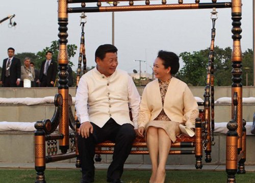 Chinese President Xi Jinping (L) and his wife Peng Liyuan sit on a swing during their visit to the state of Gujarat, India, Sept. 17, 2014.