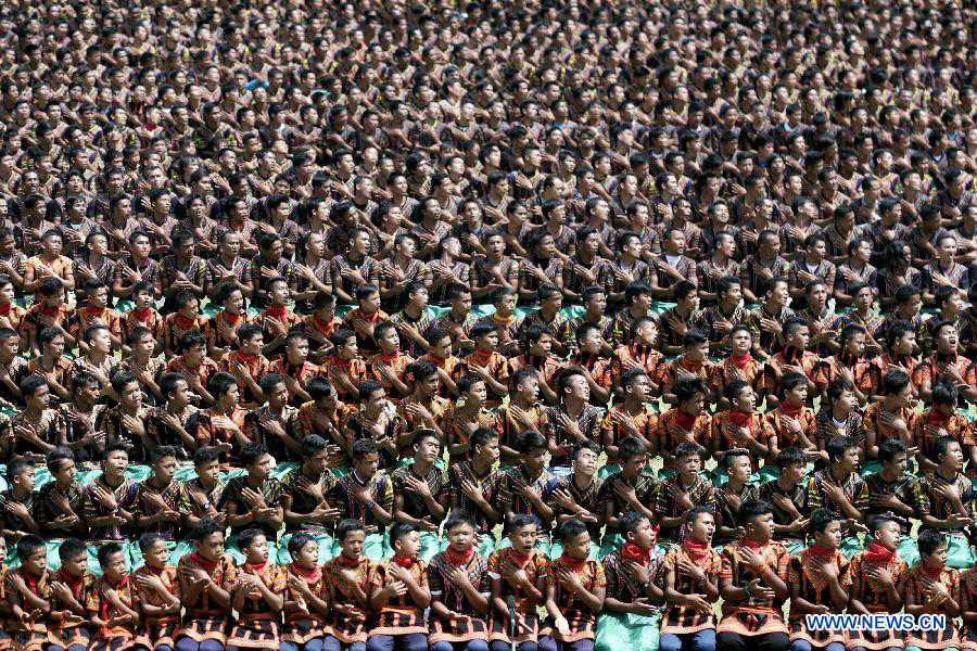 People perform Saman dance in Aceh, Indonesia, Nov. 24, 2014. More than 5,000 people participated in the mass Saman dance here on Monday. Indonesia's Saman dance was recognized as the world's intangible cultural heritage by the United Nations Educational, Scientific and Cultural Organization (UNESCO). (Xinhua/Junaidi) |