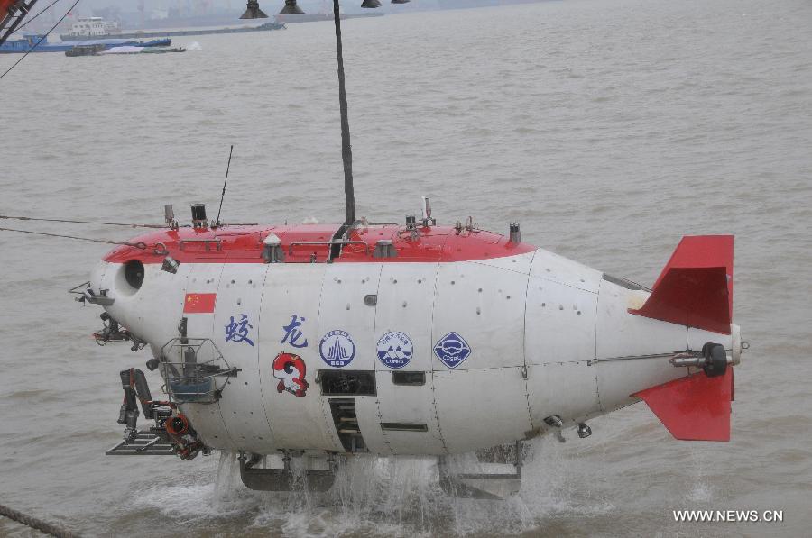 China's manned submersible Jiaolong surfaces during a drill in Jiangyin City, east China's Jiangsu Province, Nov. 24, 2014. It is the last drill for Jiaolong before it starts a scientific research voyage in the southwest Indian Ocean on Nov. 25, 2014. (Xinhua/Zhang Xudong) |