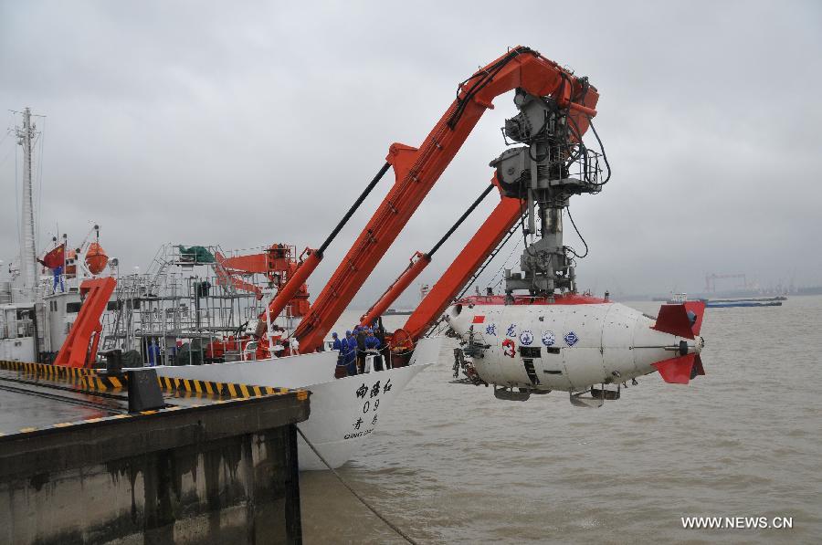 China's manned submersible Jiaolong is withdrew by its carrier during a drill in Jiangyin City, east China's Jiangsu Province, Nov. 24, 2014. It is the last drill for Jiaolong before it starts a scientific research voyage in the southwest Indian Ocean on Nov. 25, 2014. (Xinhua/Zhang Xudong) |
