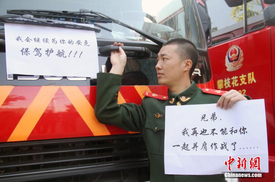 The fire brigade in southwest China's Panzhihua city presented some photos of veterans on Nov. 19, 2014. They put down their experience by dialogues with the theme of 'love proverbs' on cards and touched many people.
