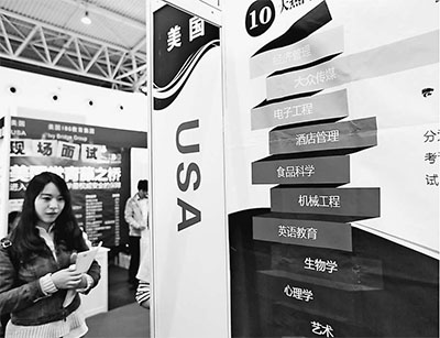 A student consults a US exhibition booth at the 2014 China International Education Exhibition Fair, Beijing. (Photo/People's Daily) |