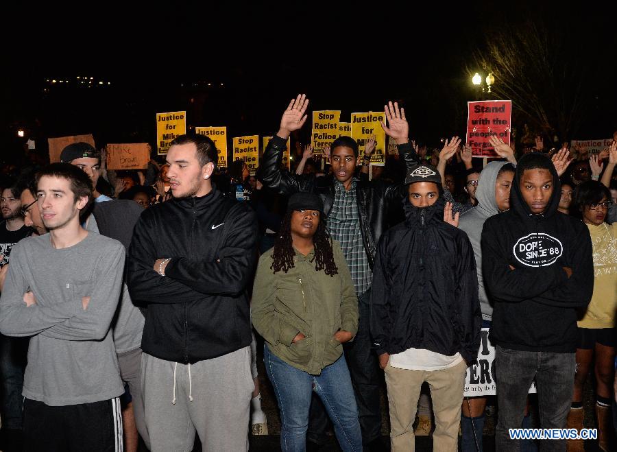 People protest against the grand jury's decision not to charge police officer Darren Wilson in the fatal shooting of African American youth Michael Brown in Ferguson in August, in front of the White House in Washington D.C., the United States, Nov. 24, 2014. More than 200 people took part in the protest in front of the White House on Monday. (Xinhua/Bao Dandan) |