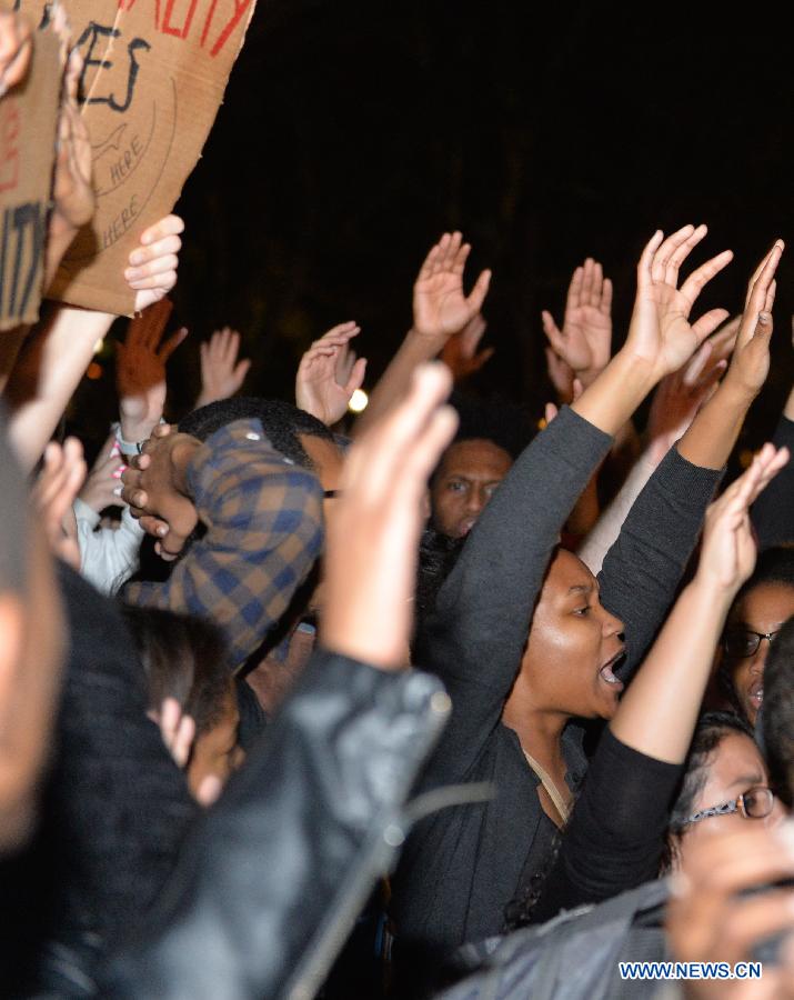 People protest against the grand jury's decision not to charge police officer Darren Wilson in the fatal shooting of African American youth Michael Brown in Ferguson in August, in front of the White House in Washington D.C., the United States, Nov. 24, 2014. More than 200 people took part in the protest in front of the White House on Monday. (Xinhua/Bao Dandan) |