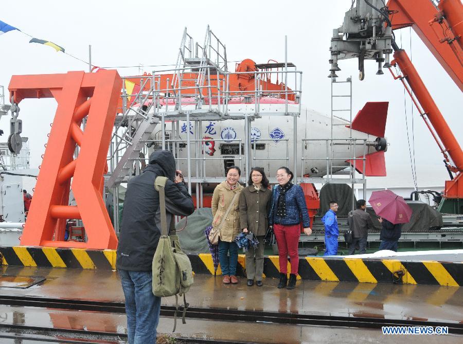 Local residents pose for photos with China's manned submersible Jiaolong in Jiangyin City, east China's Jiangsu Province, Nov. 25, 2014. Jiaolong started a scientific research voyage to the southwest Indian Ocean on Tuesday. (Xinhua/Zhang Xudong)