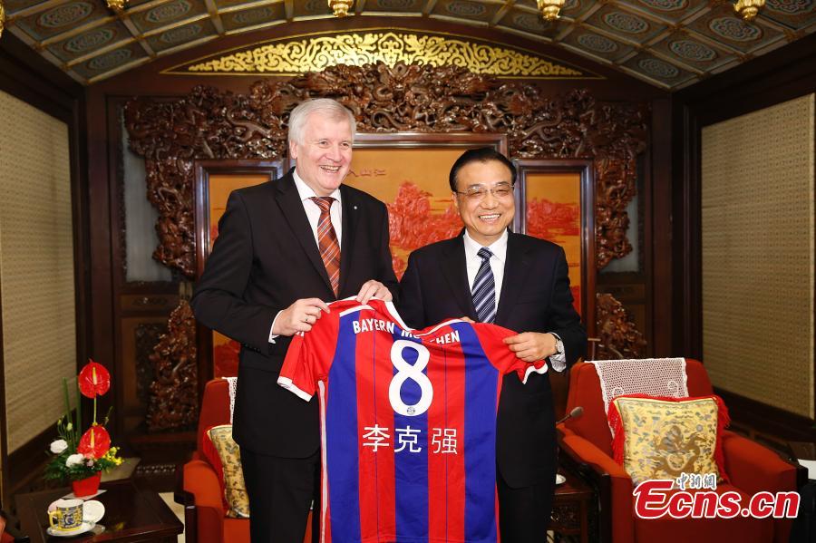 Chinese Premier Li Keqiang (R) receives a jersey of the German football team Bayern Munich as a gift from visiting governor of the German state of Bavaria Horst Seehofer in Beijing on Monday, November 24, 2014. Li expressed China’s hope to strengthen sports industry cooperation with Germany during his meeting with the visiting governor. [Photo: China News Service/ Peng Jiansheng] |