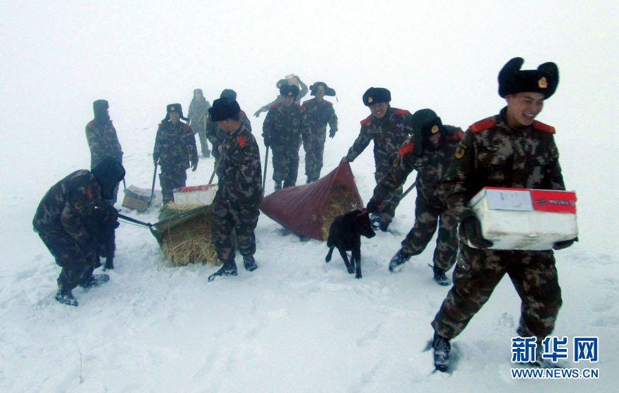 Soldiers hurry up moving the supplies before the heavy snow seals the mountain passes. (Xinhua/Ma Ding)