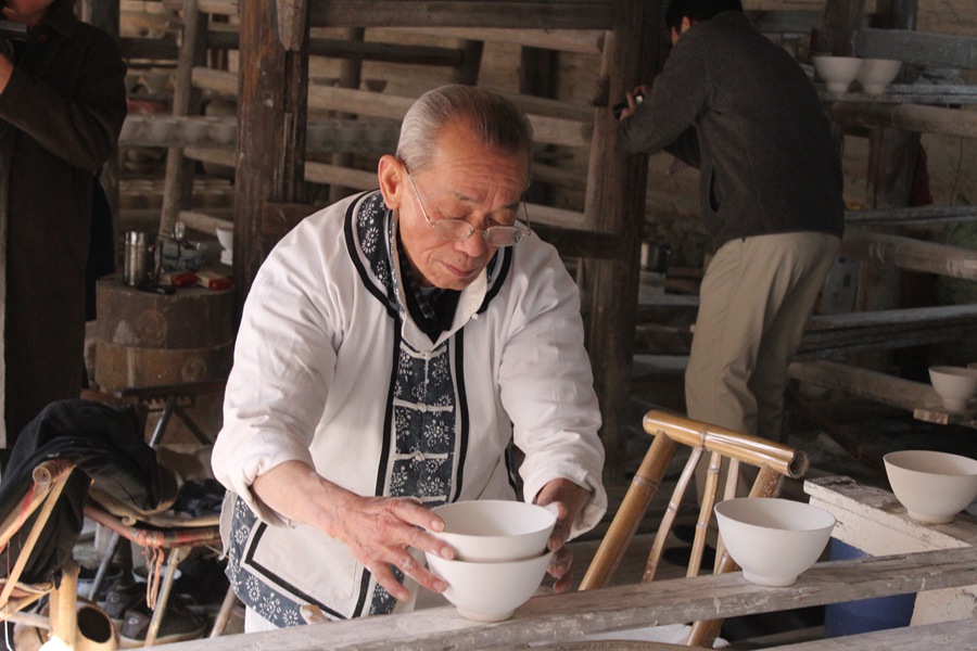 An elderly porcelain artist trims unfired porcelain products at the Jingdezhen Ancient Kilns in Jingdezhen city, Jiangxi province on Nov. 18, 2014. (Photo/People's Daily Online)