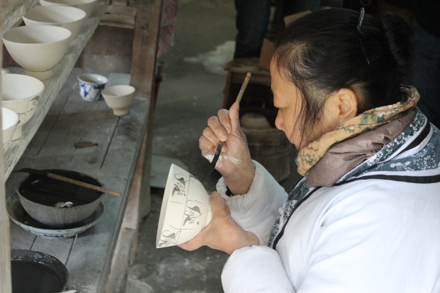 A porcelain artist takes only about 20 seconds to paint a bowl at the Jingdezhen Ancient Kilns in Jingdezhen city, Jiangxi province on Nov. 18, 2014. (Photo/People's Daily Online)
