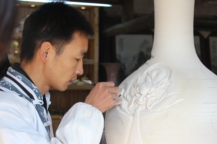 A young porcelain artist carves a delicate porcelain piece at the Jingdezhen Ancient Kilns in Jingdezhen city, Jiangxi province on Nov. 18, 2014. (Photo/People's Daily Online)