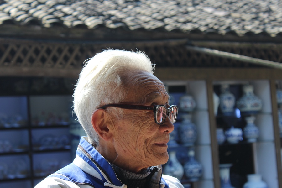 An elderly porcelain artist paints a porcelain piece at the Jingdezhen Ancient Kilns in Jingdezhen city, Jiangxi province on Nov. 18, 2014. (Photo/People's Daily Online)
