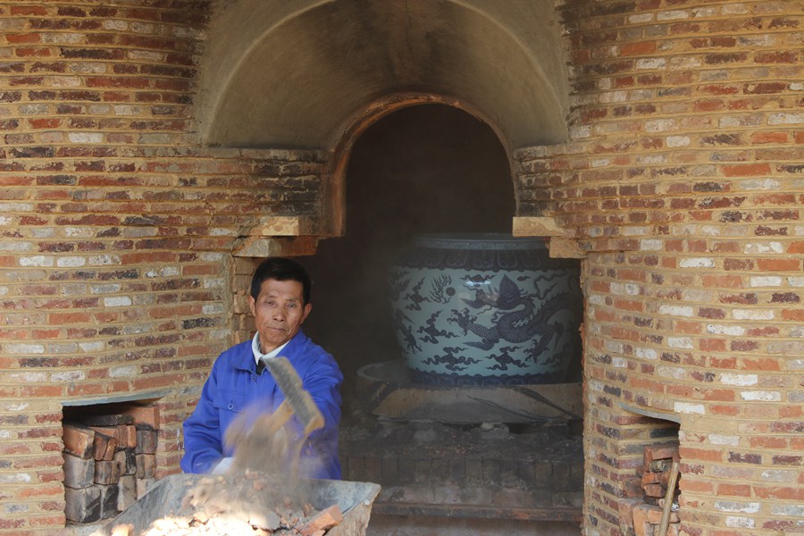 A dragon jar, which just finished a 15-day cooling down from a seven-day treatment in a kiln at the Jingdezhen Ancient Kilns on Nov 18, 2014. (Photo/People's Daily Online) |