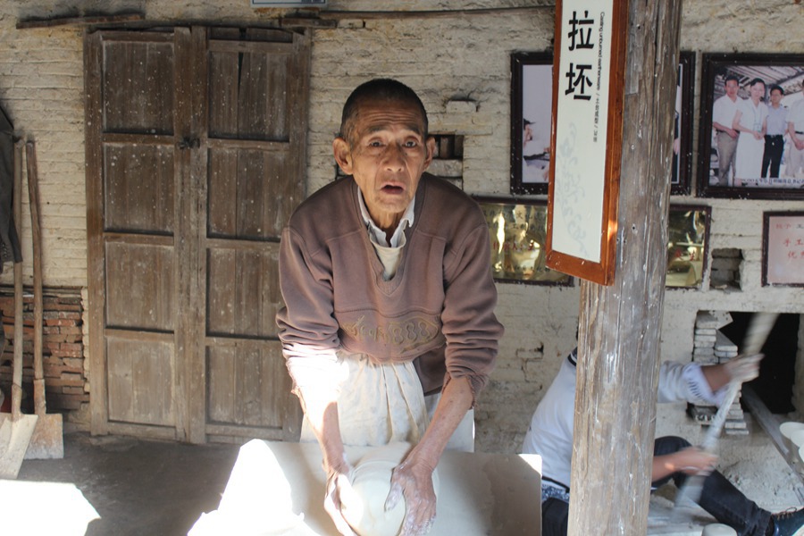 A porcelain artist makes earthen ware for porcelain products at the Jingdezhen Ancient Kilns in Jingdezhen city, Jiangxi province on Nov. 18, 2014. (Photo/People's Daily Online)