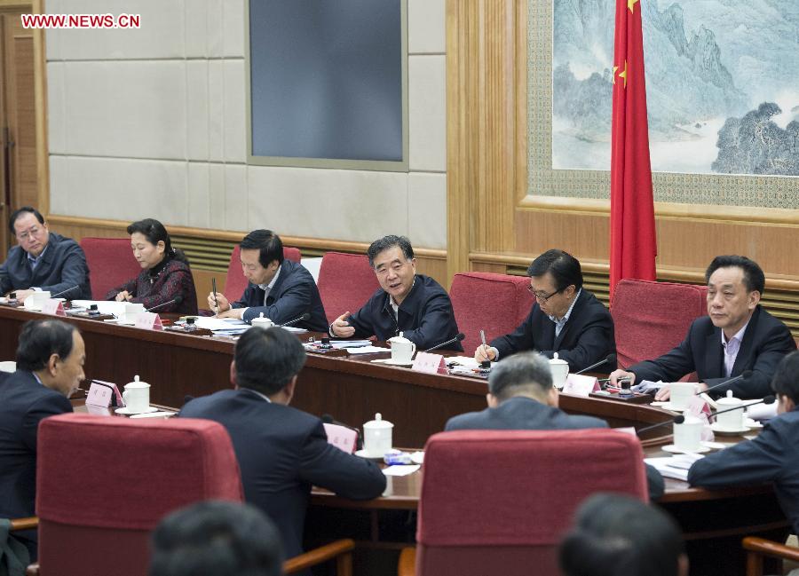 Chinese Vice Premier Wang Yang (3rd R, back), presides over a national meeting on combating intellectual property rights infringement and the manufacturing and sale of fake and shoddy goods, in Beijing, capital of China, Nov. 25, 2014. (Xinhua/Wang Ye)