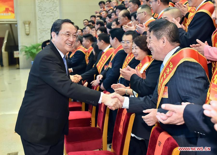Yu Zhengsheng, chairman of the National Committee of the Chinese People's Political Consultative Conference (CPPCC), meets with representatives attending an awards ceremony for 100 outstanding figures in the private sector in Beijing, capital of China, Nov. 25, 2014. An awards ceremony for 100 outstanding figures in the private sector was held in Beijing Tuesday. (Xinhua/Li Tao) |