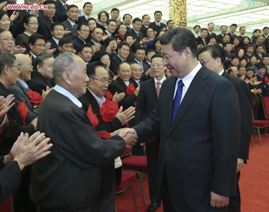 Senior Chinese leaders Xi Jinping, Liu Yunshan, Zhang Gaoli and others meet with representatives of distinguished veteran cadre individuals and groups at the Great Hall of the People in Beijing, capital of China, Nov. 26, 2014. (Xinhua/Lan Hongguang) |