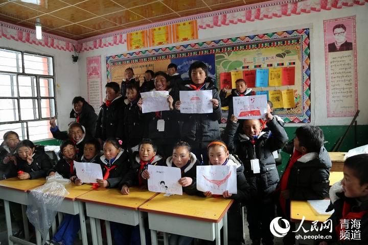 Children in new clothes and shoes hold up their paintings, expressing their thanks to Premier Li. (Photo/qh.people.cn)