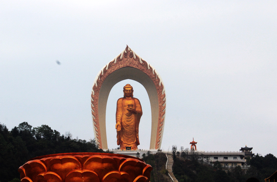 The Donglin Buddha statue is seen at the Donglin Temple in Xingzi County of Jiujiang City, east China's Jiangxi Province on Nov.19, 2014. The bronze statue of Amitabha Buddha, which is 48 meters meters high, is believed to be the tallest of its kind in the world. The project, with the total cost of about 1 billion yuan (about 161 million dollars), has been basically completed. It was totally funded by private donations. (Photo/People's Daily Online) |