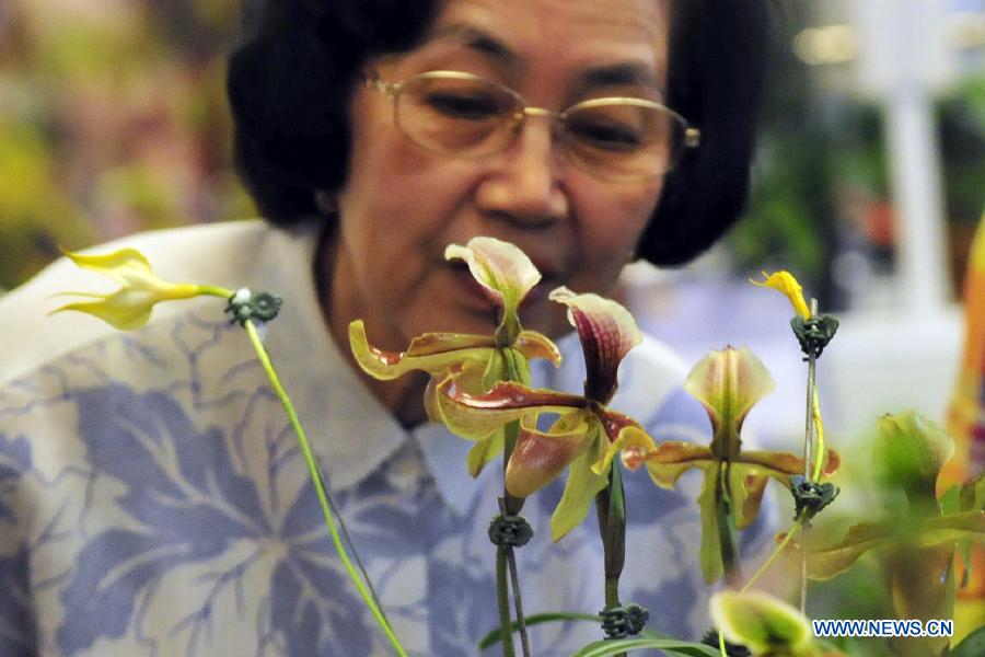 A visitor watches orchids on the 8th Siam Paragon Bangkok Royal Orchid Paradise in Bangkok, Thailand, Nov. 27, 2014. (Xinhua/Rachen Sageamsak)