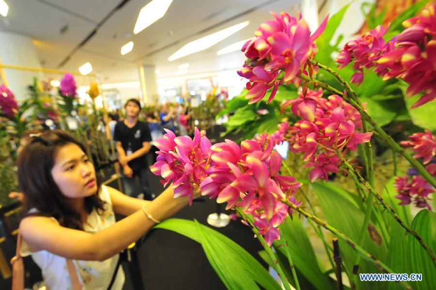 Visitors watch orchids on the 8th Siam Paragon Bangkok Royal Orchid Paradise in Bangkok, Thailand, Nov. 27, 2014. (Xinhua/Rachen Sageamsak)