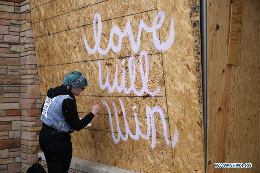 A resident paints mural on the board of a storefront in Ferguson, Missouri, the United States, on Nov. 26, 2014. Missouri Governor Jay Nixon has called in more National Guards to control the situation. Some 2,200 National Guards have been deployed in Ferguson by Wednesday. (Xinhua/Jim Vondruska) |