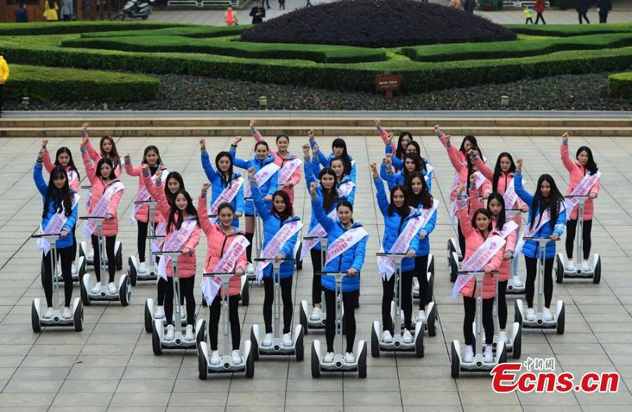 School beauties from over 20 Chinese universities ride two-wheeled scooters during a competition in Changsha, Hunan province on November 26, 2014. The event was held to promote low-carbon choices of transportation. [Photo/ Yang Huafeng] |