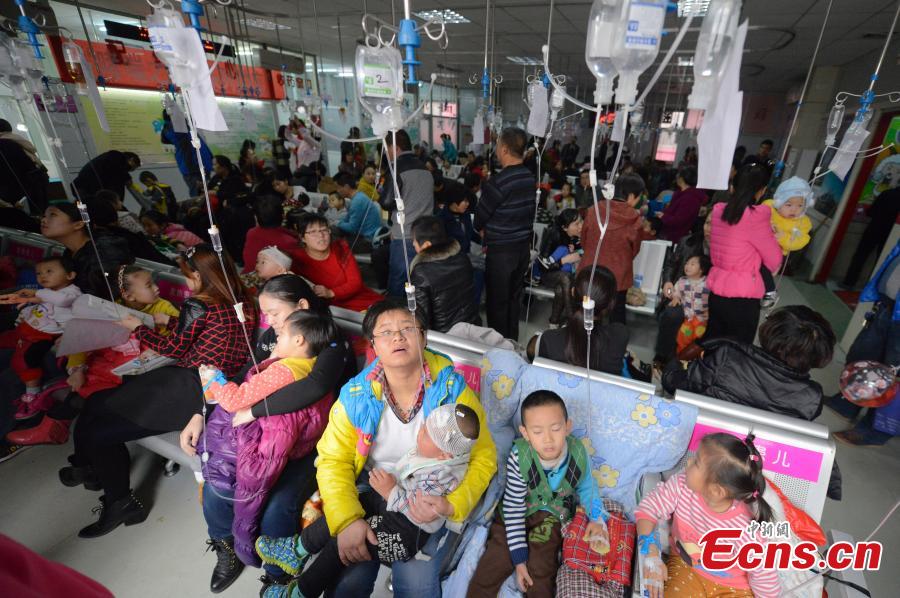 Children receive infusion at a children's hospital in Taiyuan of Shanxi province, November 26, 2014. Due to continued smog and temperature changes, the daily outpatient number recently has been increased by 50 percent than last month. Most of them suffered from respiratory diseases, according to doctors. [Photo: China News Service / Wei Liang] |