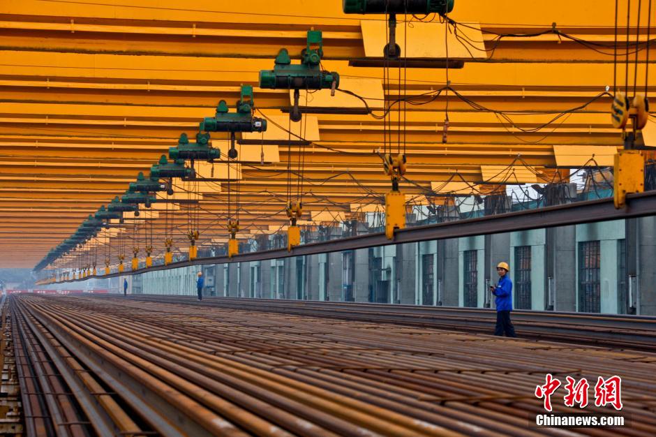500-meter-long tracks lying in Xiangtang welding workshop. (CNS/Zhang Weidong)