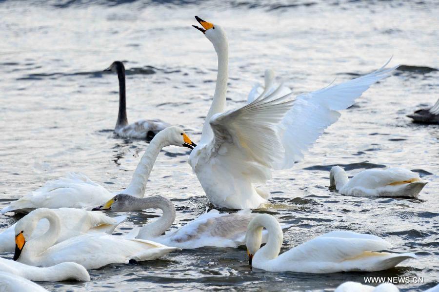 Swans look for food on a lake in Rongcheng, east China's Shandong Province, Nov. 28, 2014. Several tens of thousands of swans migrating from Siberia converged in Rongcheng to pass the winter recently. (Xinhua/Guo Xulei)