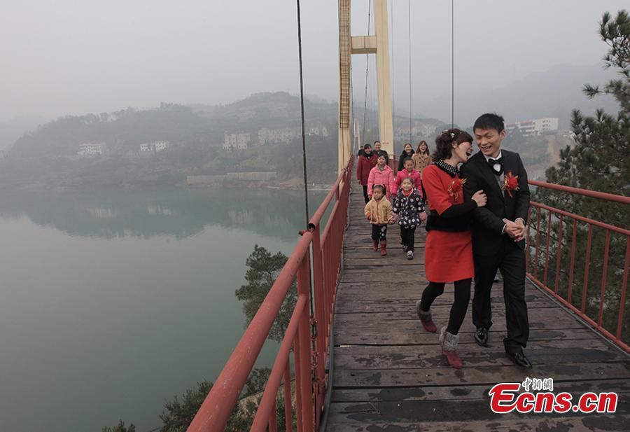 A bride and groom walk through a bridge in the new county of Zigui on December 28, 2013. [Photo/Li Feng]