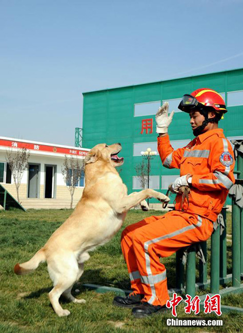 The fireman and his rescue dogs. (CNS/Shi Yonghong)