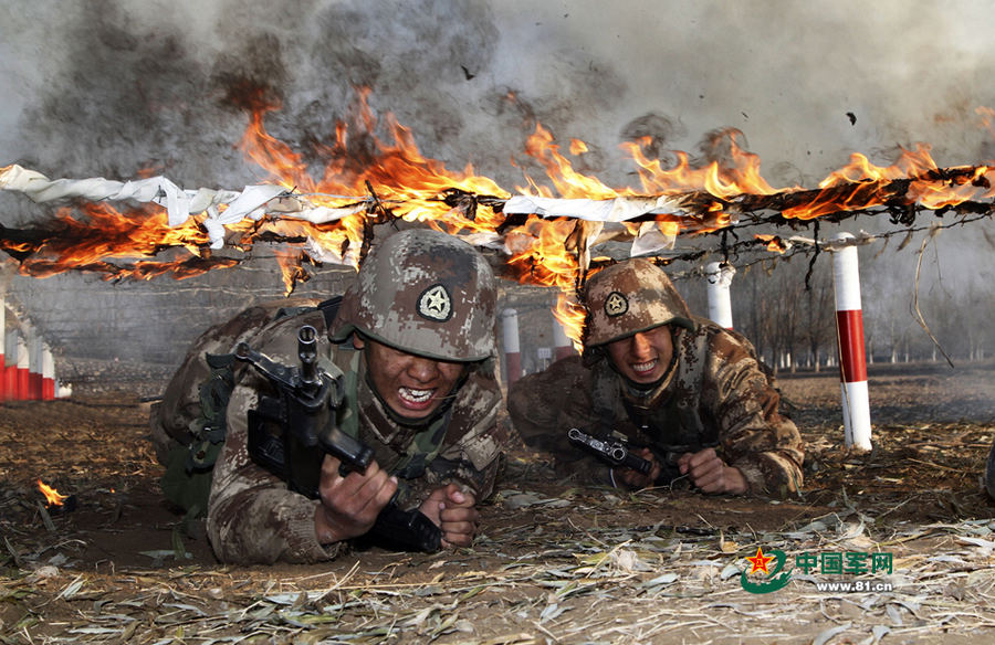 Newly recruited soldiers take part in extreme training at a training base in Lanzhou Military Area Command, northwest China. The training is designed to intensify their physical and psychological capabilities as required in actual combat. (Source: www.81.cn) |