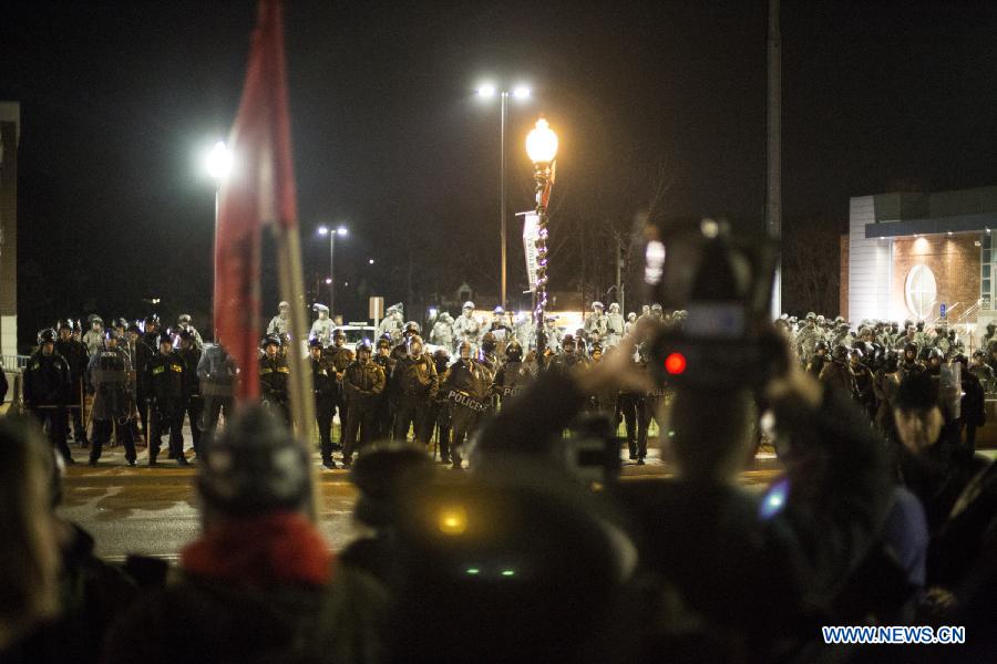 Protesters use a loud speaker to chant and communicate their views toward National Guard and Police Forces in Ferguson, Missouri, the United States, on Nov. 28, 2014. Police arrested 15 people Friday night as about 100 protesters blocked traffic in front of the local police department in Ferguson. The protest was the latest one in reaction to the non-indictment of police officer Darren Wilson, who shot and killed unarmed 18-year-old black youth Michael Brown in August. (Xinhua/Jim Vondruska) |