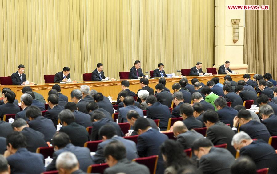 Chinese President Xi Jinping (C, rear), also general secretary of the Communist Party of China (CPC) Central Committee and chairman of the Central Military Commission (CMC), addresses the central foreign affairs meeting held on Nov. 28 to 29, 2014 in Beijing, capital of China. (Xinhua/Ma Zhancheng)