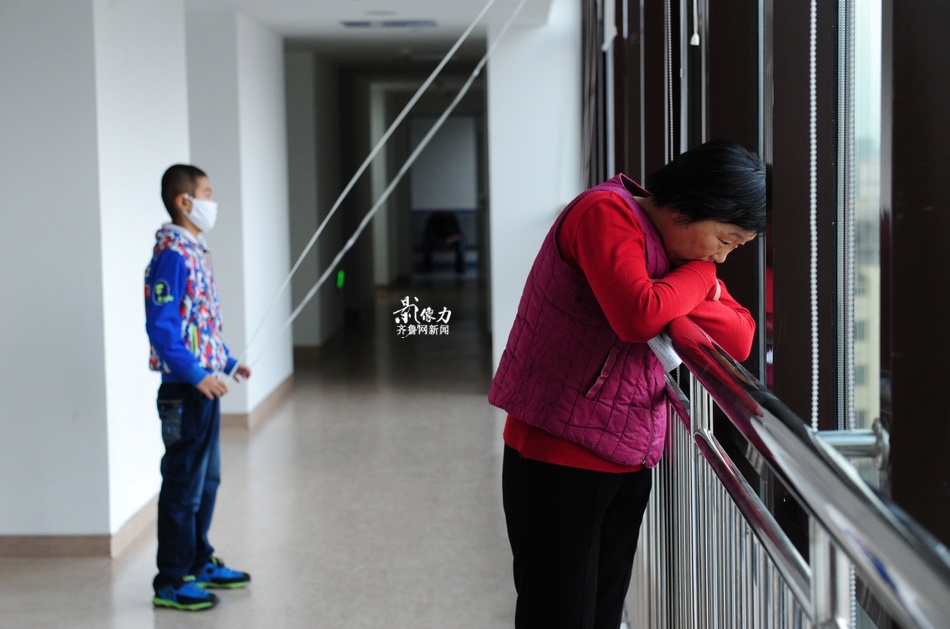 Leaning on the wall, Huang looks at the outside world in the corridor. The mother of another patient seems to be overloaded bending over a handrail in the corridor. (Iqili/Yu Peng, Li Ruiping)