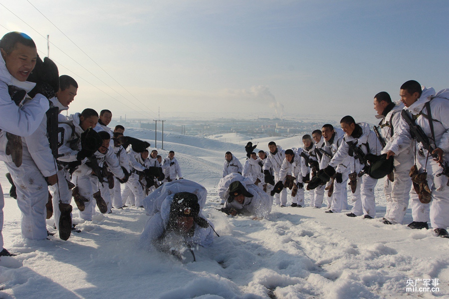 Chinese border soldiers march on a snow mountain during the winter military training in northwest China's Xinjiang Uygur Autonomous Region, Nov. 30, 2014. Soldiers went through harsh environment as the local temperature dropped to minus 25 degrees Celsius here. (Source: mil.cnr.cn)