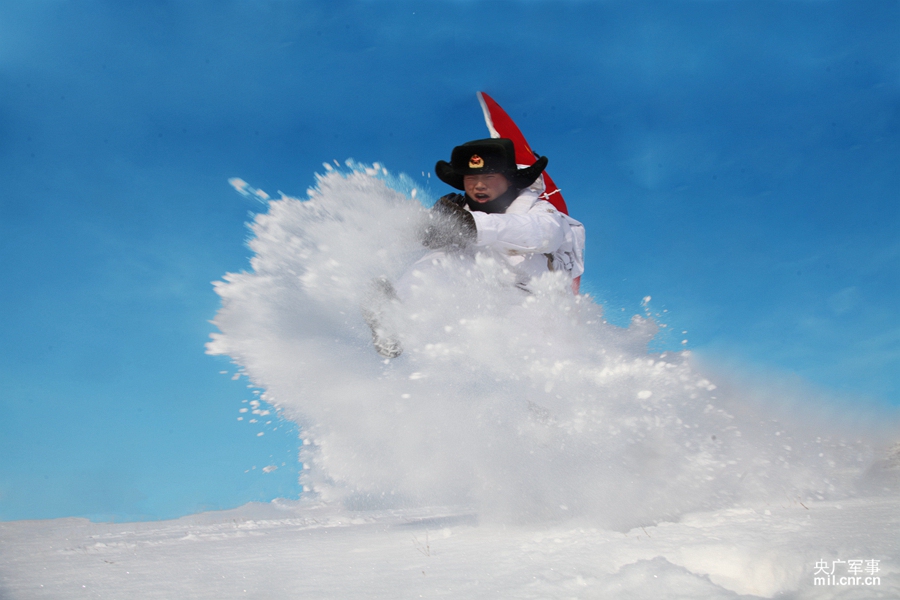 Chinese border soldiers march on a snow mountain during the winter military training in northwest China's Xinjiang Uygur Autonomous Region, Nov. 30, 2014. Soldiers went through harsh environment as the local temperature dropped to minus 25 degrees Celsius here. (Source: mil.cnr.cn) |