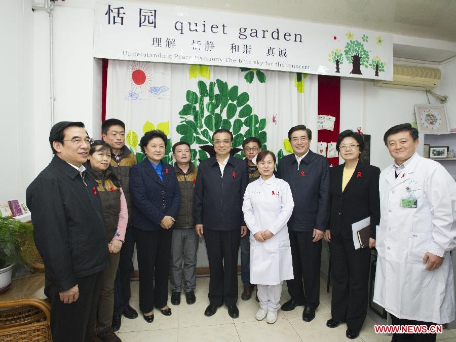 Chinese Premier Li Keqiang(C) poses for a group photo with volunteers working at Quit Garden during his visit to Beijing's YouAn Hospital, home to a center for HIV/AIDS treatment, in Beijing, capital of China, ahead of World AIDS Day. (Xinhua/Xie Huanchi) |