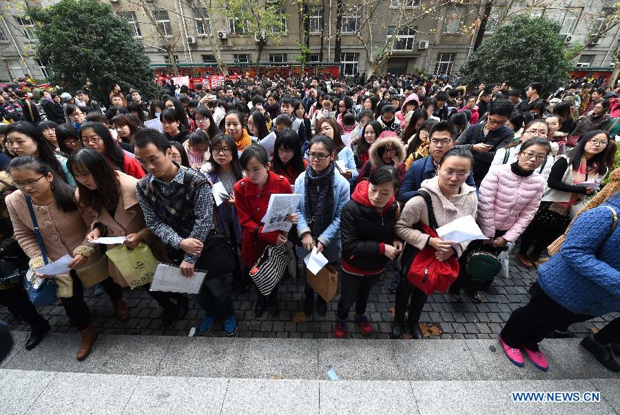 Candidates wait for examination outside Nanjing Forestry University exam site in Nanjing, capital of east China's Jiangsu Province, Nov. 30, 2014. 2015 National Civil Service Examination began on Sunday, offering at least 22,200 vacancies as planned. (Xinhua/Sun Can) |