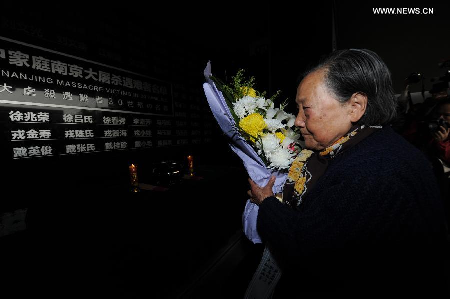 Xia Shuqin, a survivor of the Nanjing Massacre, mourns her family members in front of a wall with "List of Nanjing Massacre Victims in 30 Families" at the Memorial Hall of the Victims in Nanjing Massacre by Japanese Invaders in Nanjing, capital of east China's Jiangsu Province, Dec. 1, 2014. A series of ceremonies were held by people to mourn their family members killed in the 1937 massacre ahead of the National Memorial Day for Nanjing Massacre Victims, which falls on Dec. 13. (Xinhua/Sun Can)
