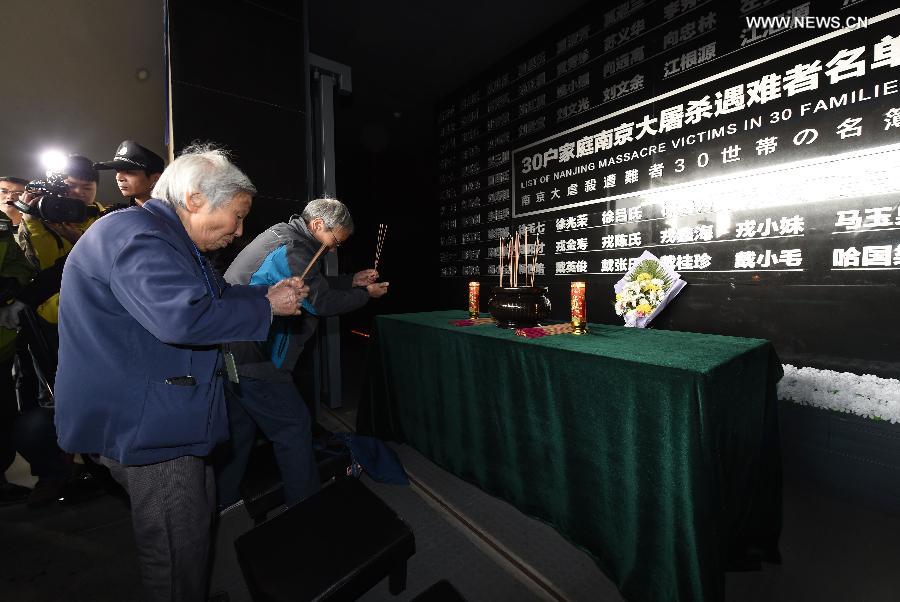 Yang Cuiying (L, front), a survivor of the Nanjing Massacre, mourns her family members in front of a wall with "List of Nanjing Massacre Victims in 30 Families" at the Memorial Hall of the Victims in Nanjing Massacre by Japanese Invaders in Nanjing, capital of east China's Jiangsu Province, Dec. 1, 2014. A series of ceremonies were held by people to mourn their family members killed in the 1937 massacre ahead of the National Memorial Day for Nanjing Massacre Victims, which falls on Dec. 13. (Xinhua/Sun Can)